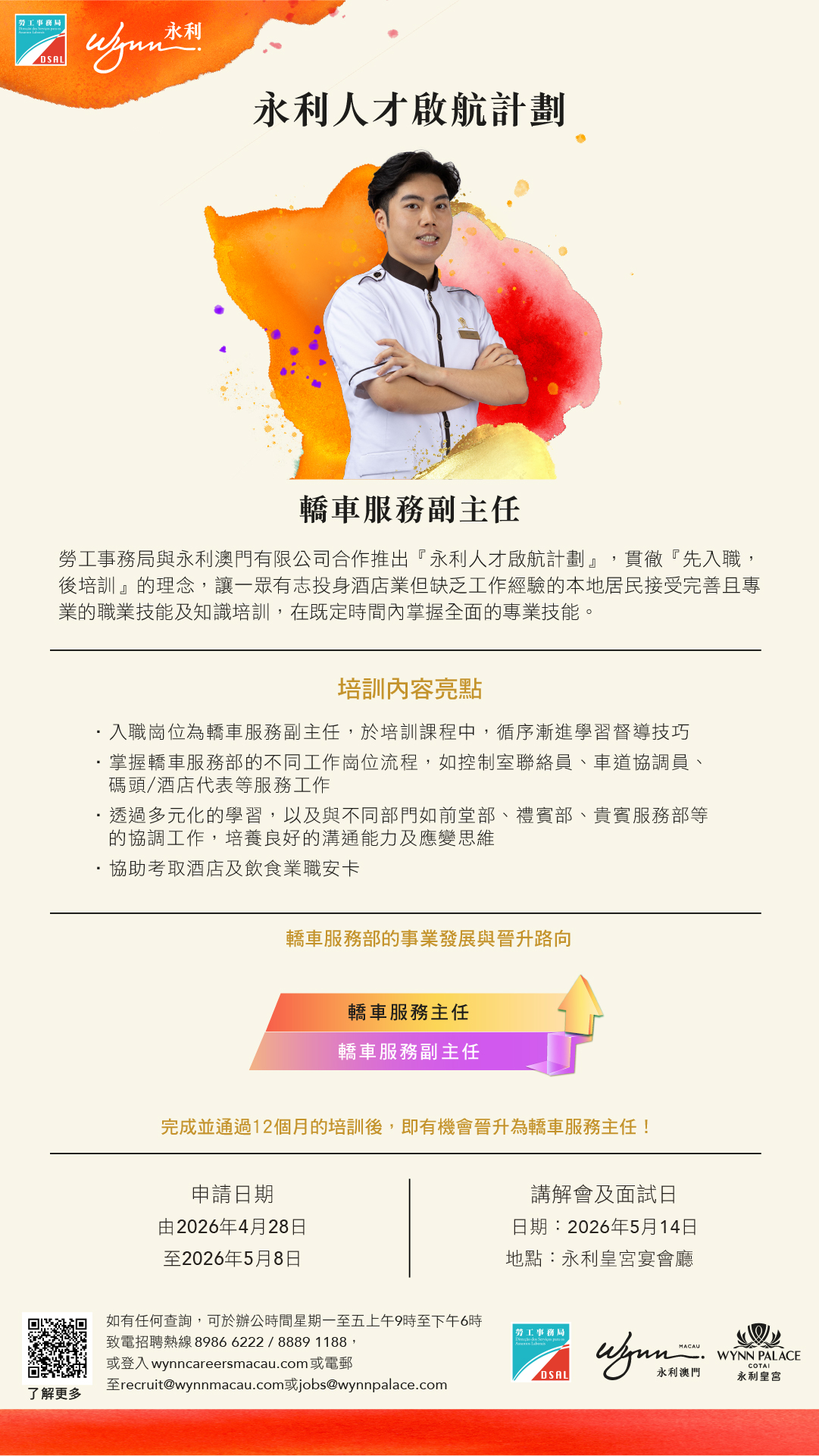 🔹計劃結束:完成培訓並通過評核後獲晉升為『前堂服務主任』(月薪為18,780澳門元)。