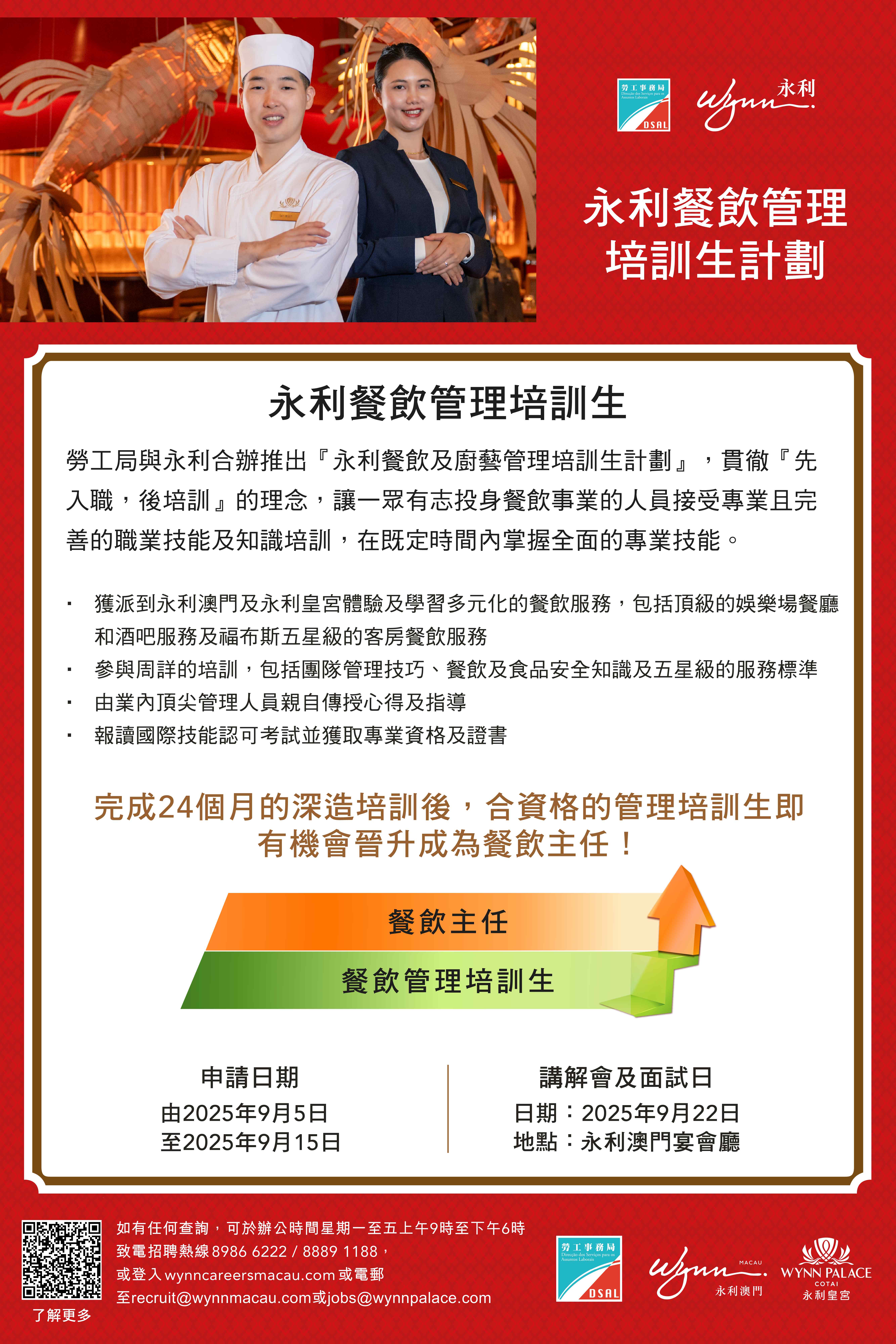 電話:(853)8399 9821(勞工局 何小姐),或(853)8986 6222(永利招聘熱缐 王小姐)。